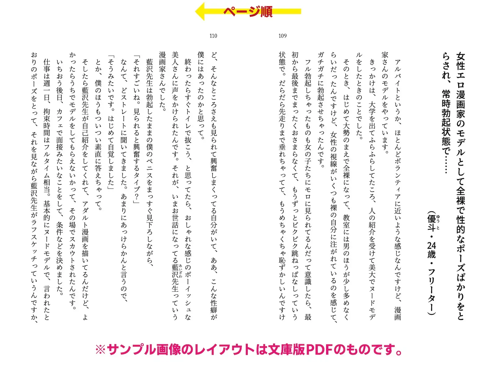 さて、あらためて本作の話に移りますと、二〇二三年に発表しました『着衣女性×露出男性 勃起見せつけ体験集』に続く、男性が露出側となる体験談シリーズの第二弾となっております。完全CFNMのエピソードが前作では五話、今作では六話と微増。女性に射精まで見られるエピソードは前作九話、今作一〇話とこちらも微増かつパーフェクトという構成です。全編射精見せつけです。たまりませんね。