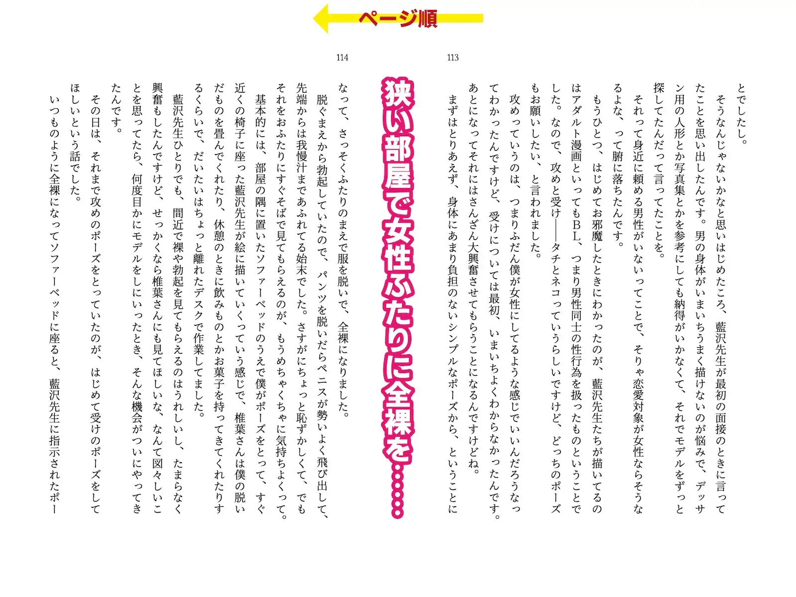 しかも漫画家さんはBLを描いていて、そのため語り手さんは攻め側のみならず、受け側の、いっそう恥ずかしい格好もとらされることになります。