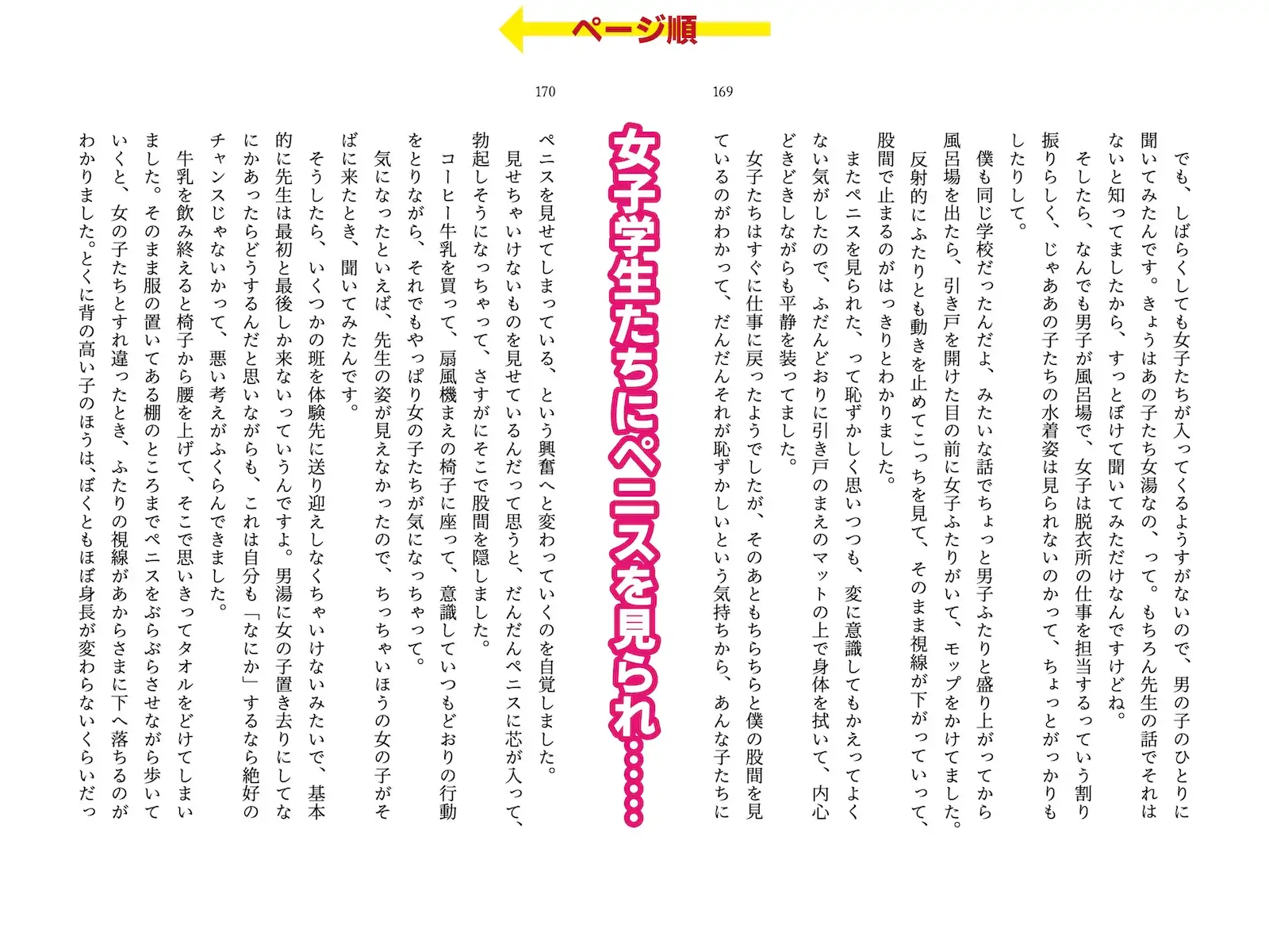 このお話では語り手さんの通う銭湯の男湯に、男女混合の班が一週間の職場体験にやってきて、ふたりの女子にペニスをちらちら見られているうちにすっかり興奮してしまい、自分からもわざと見せにいくようになって……という展開をたどるのですが、終盤はいくらなんでもさすがにやりすぎでしょう。女子たちもあまりに無邪気というかノリがよすぎるというか。